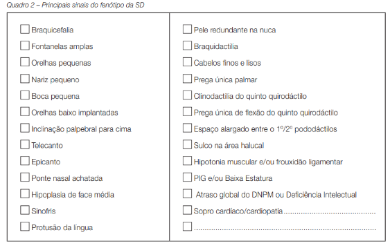 O diagnóstico clínico de SD baseia-se no reconhecimento de características físicas. A segurança do diagnóstico clínico aumenta quanto mais características específicas da SD forem identificadas na criança e descritas como sinais cardinais de Hall (Quadro 1), estabelecendo que 100% dos recém-nascidos com SD apresentam pelo menos quatro destes sinais e 89% terão seis destes sinais.